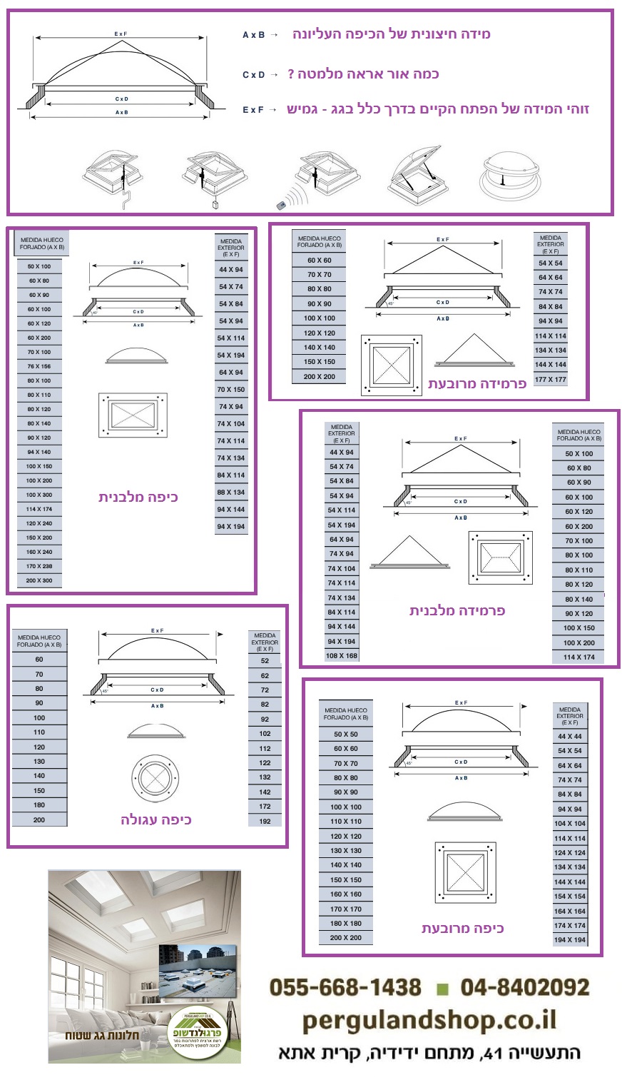 חלונות גג SKYLIGHT מקצועיים מסופקים בצורות ריבוע, מלבן, פרמידה או עגול. החלונות מיוצרים בעשרות מידות שונות ומיועדים למגוון מטרות, החל מהחדרת אור טבעי מהגג, שחרור עשן, יציאה לג או אוורור ע"י תבריג או מנוע.